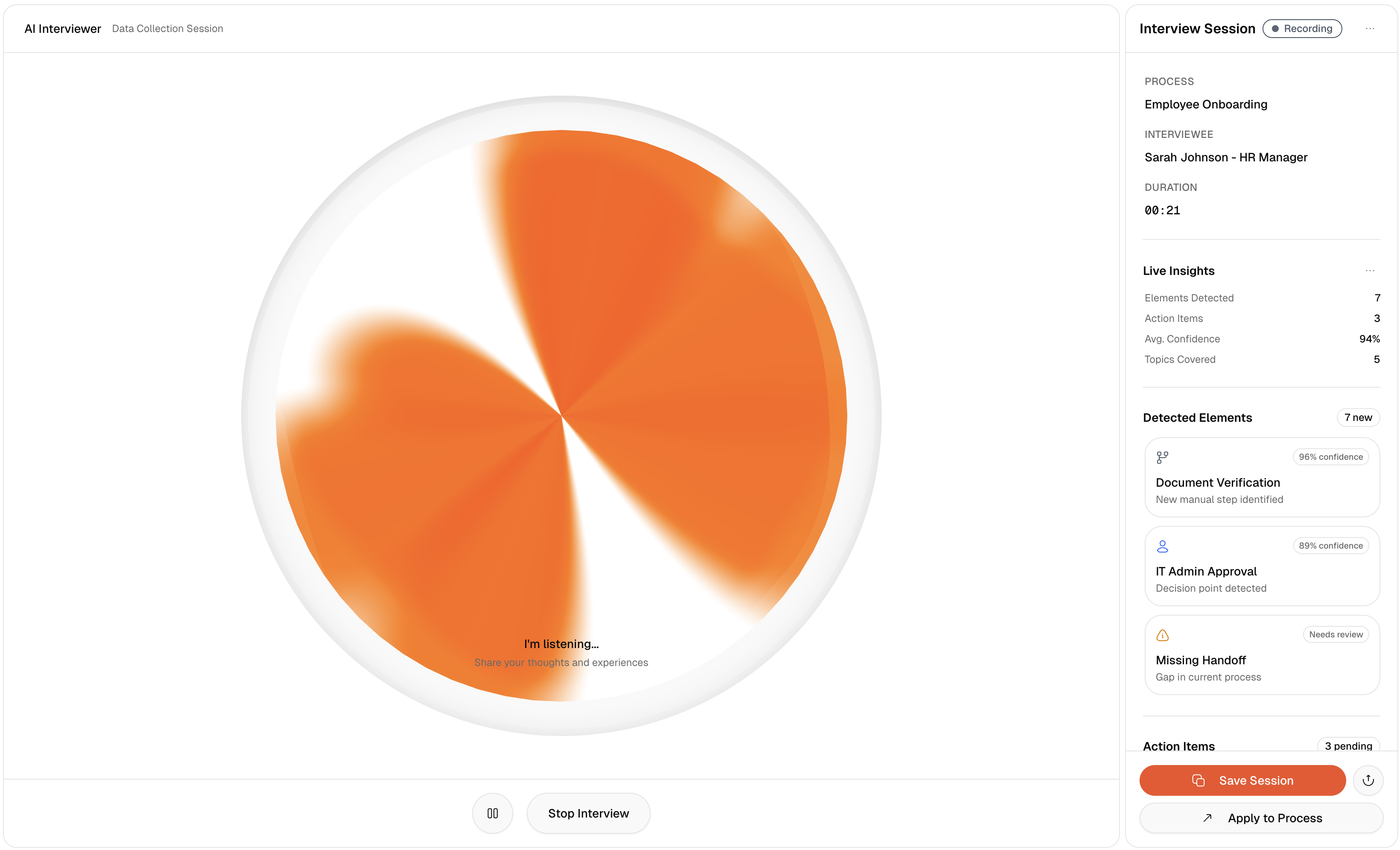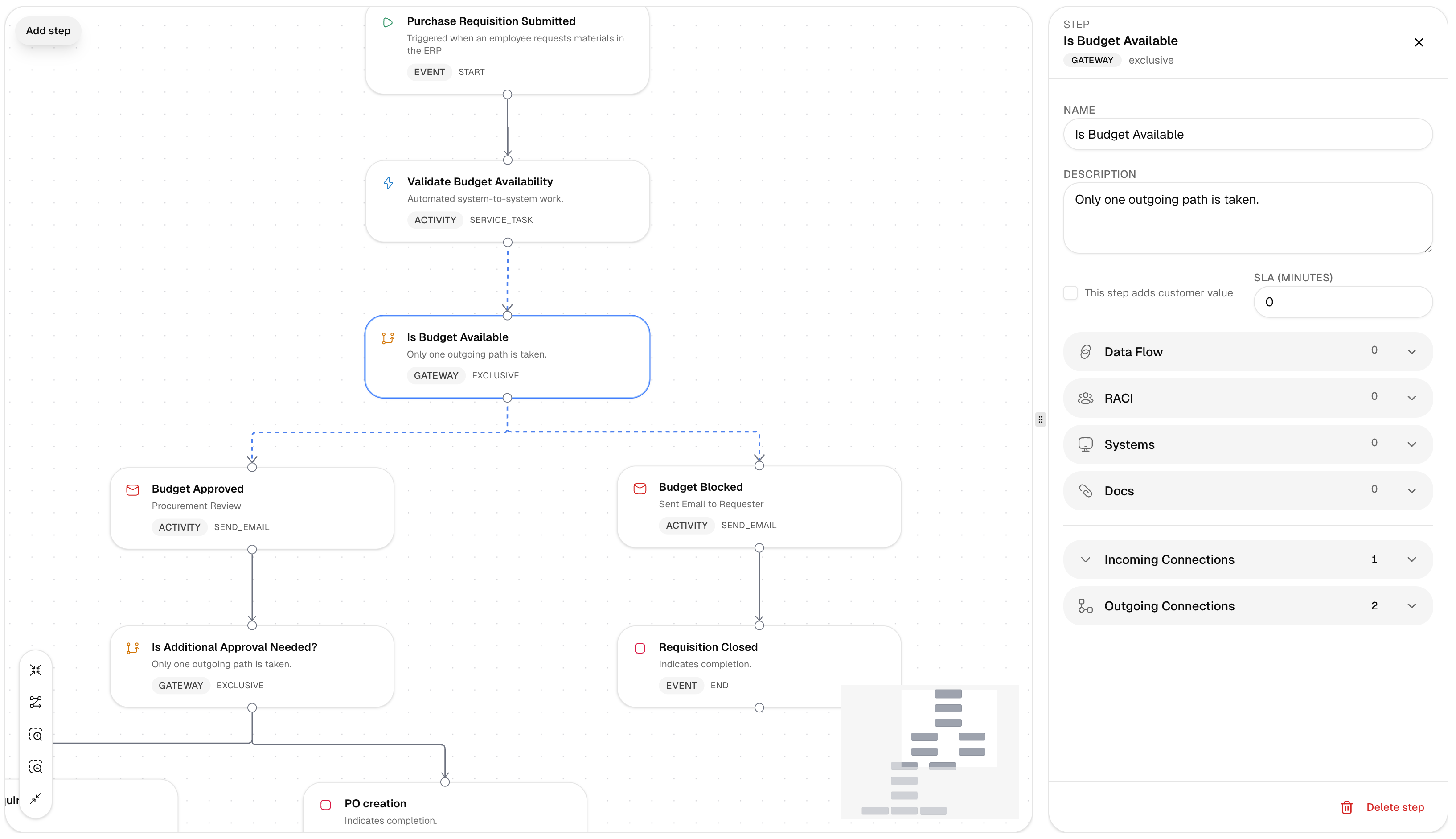 Explain your workflow in plain language. Cesio listens, structures, and converts your description into a complete process map.