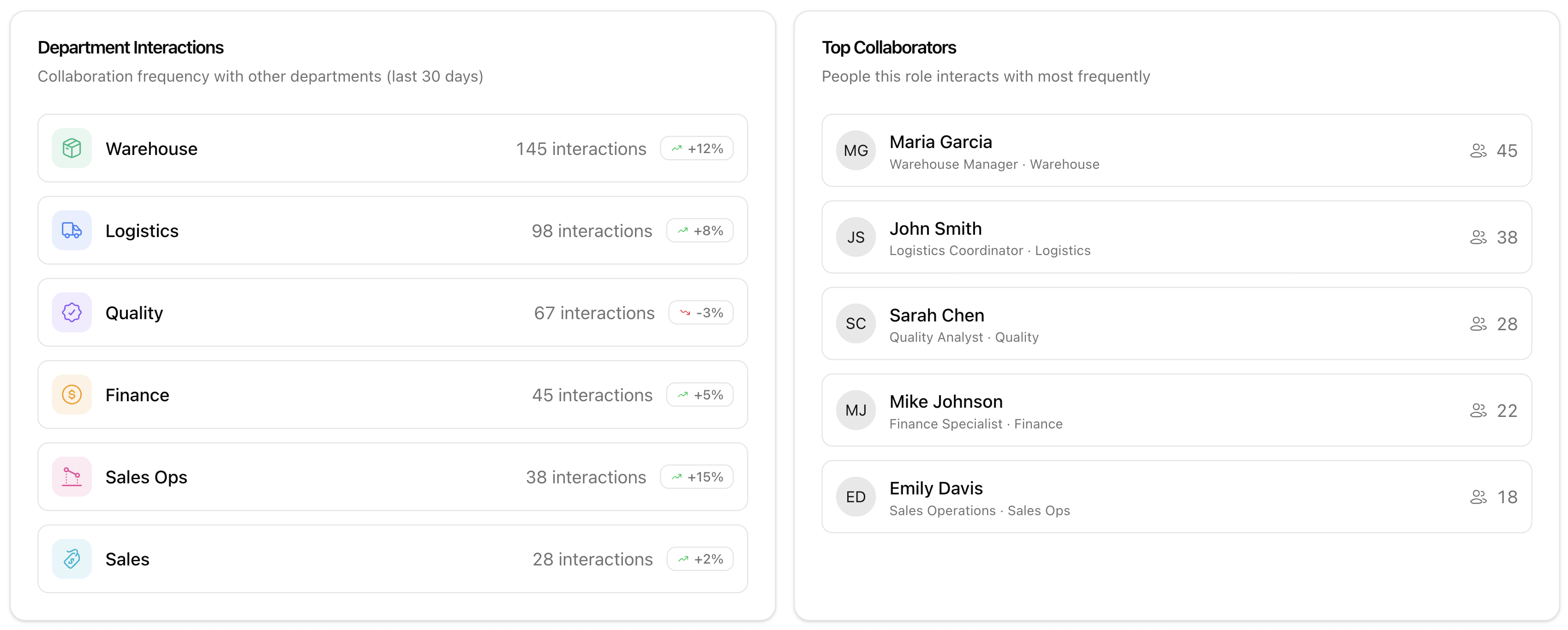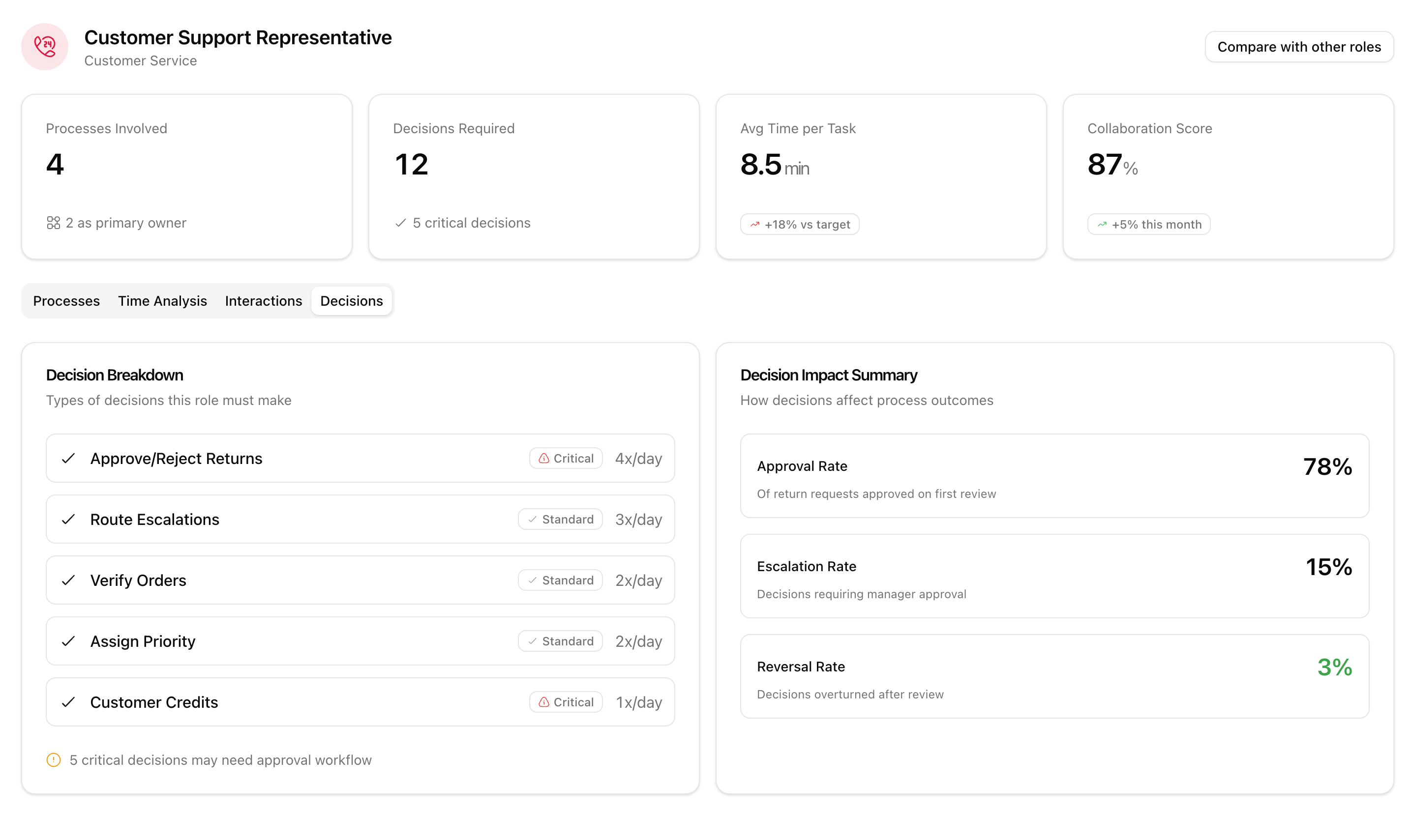 Understand how each role fits into the system. Visualize dependencies, responsibilities, handoffs, and workload patterns instantly.